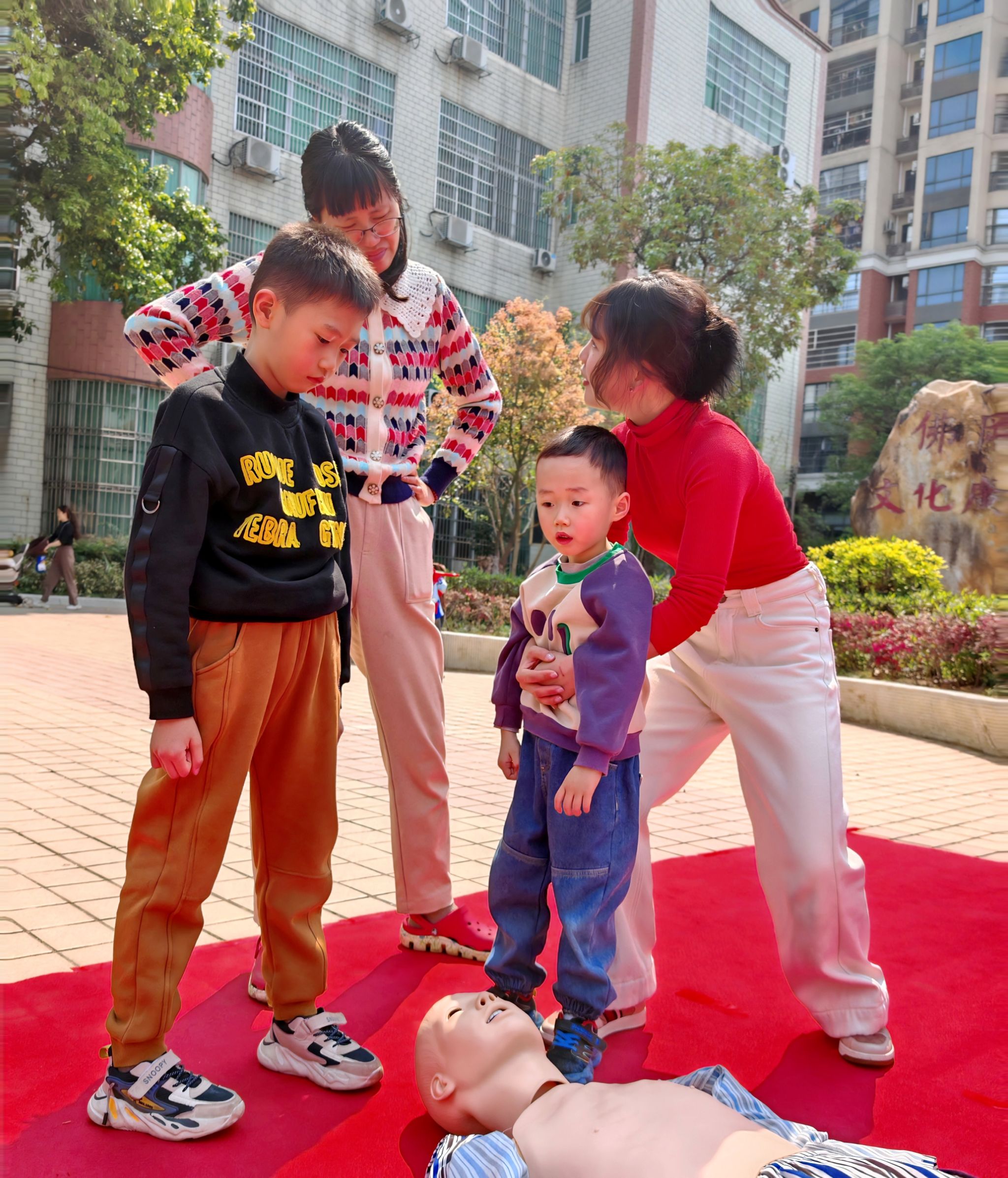 在CPR心肺复苏实操环节,志愿者们借助模拟假人指导居民掌握正确按压位置和力度;海姆立克急救法讲解中,不仅阐释原理和步骤,还引导居民针对不同年龄段进行模拟演练。现场小朋友也积极参与,收获颇丰。