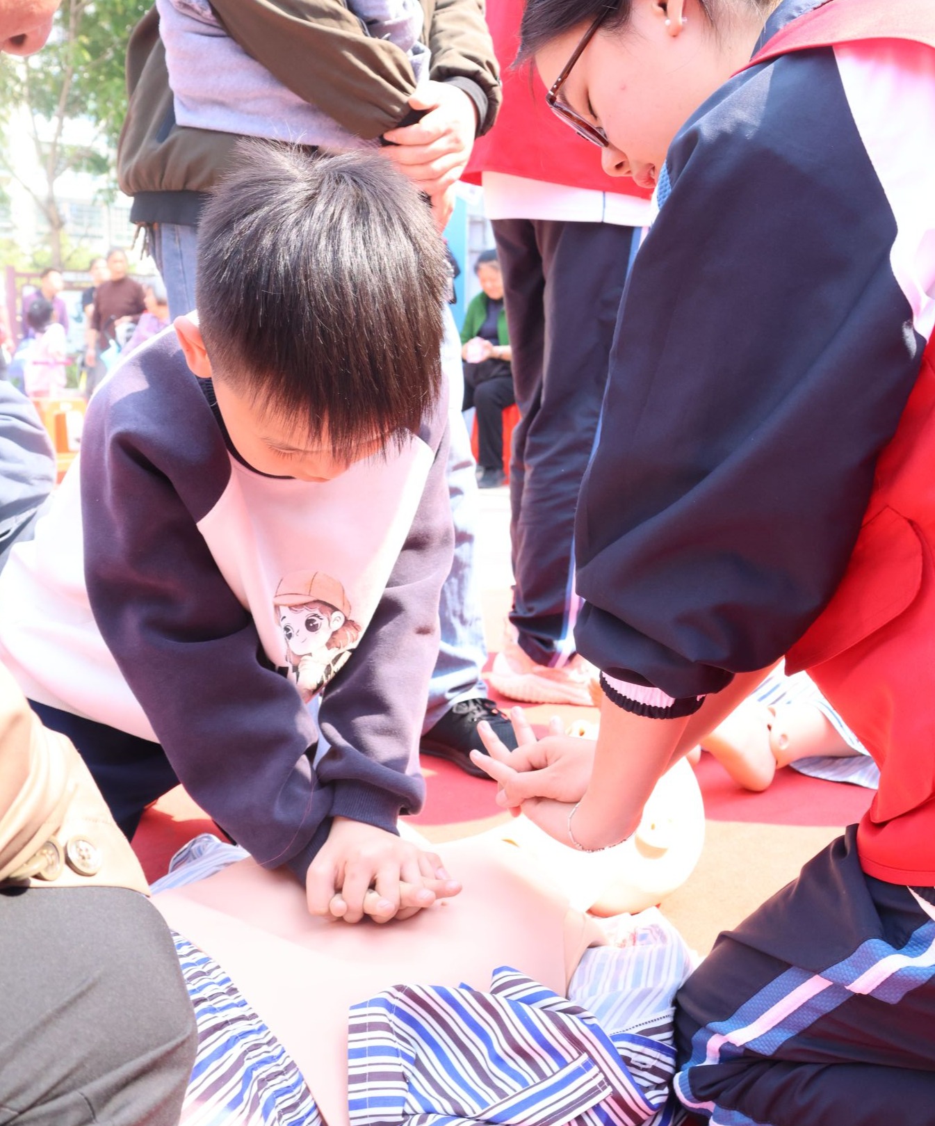 “小小急救员”训练中、海姆立克演示教学