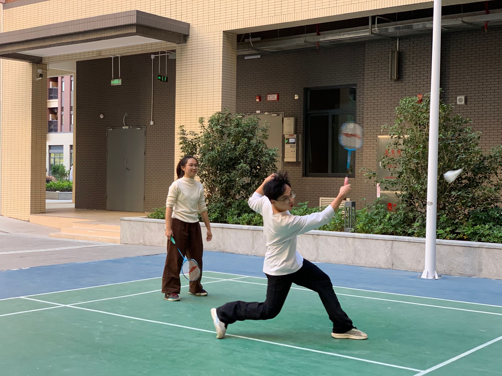 本次比赛采用混合双打赛制,实行三局两胜、每球得分。教师们一改平日严谨形象,在赛场上展现出敏捷身手与竞技热情。发球精准落点巧妙,网前轻吊与后场高远球交替运用,战术执行清晰。比赛中不乏跃起扣杀的精彩瞬间和鱼跃救球的惊险场面,每一分都赢得现场阵阵掌声与喝彩。从小组循环到淘汰晋级,赛事逐渐进入白热化。搭档之间默契补位、相互配合;对手之间激烈交锋,亦不忘彼此鼓励。赛场边,由师生组成的啦啦队热情助威,“好球”“稳住”的呐喊声此起彼伏,现场氛围热烈而融洽。