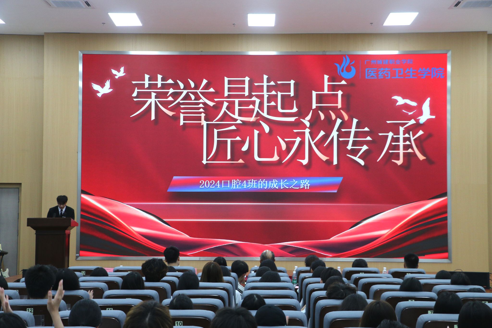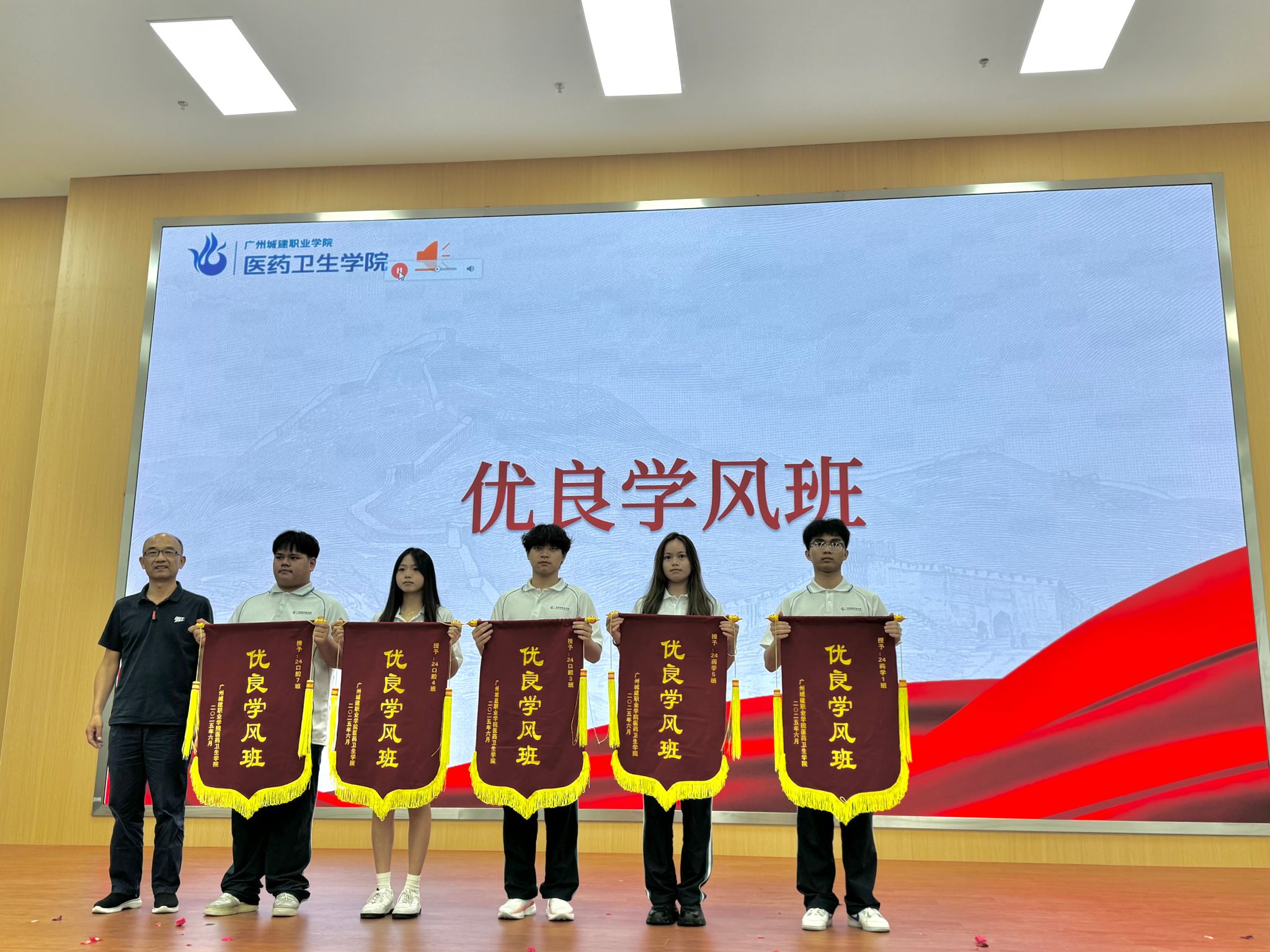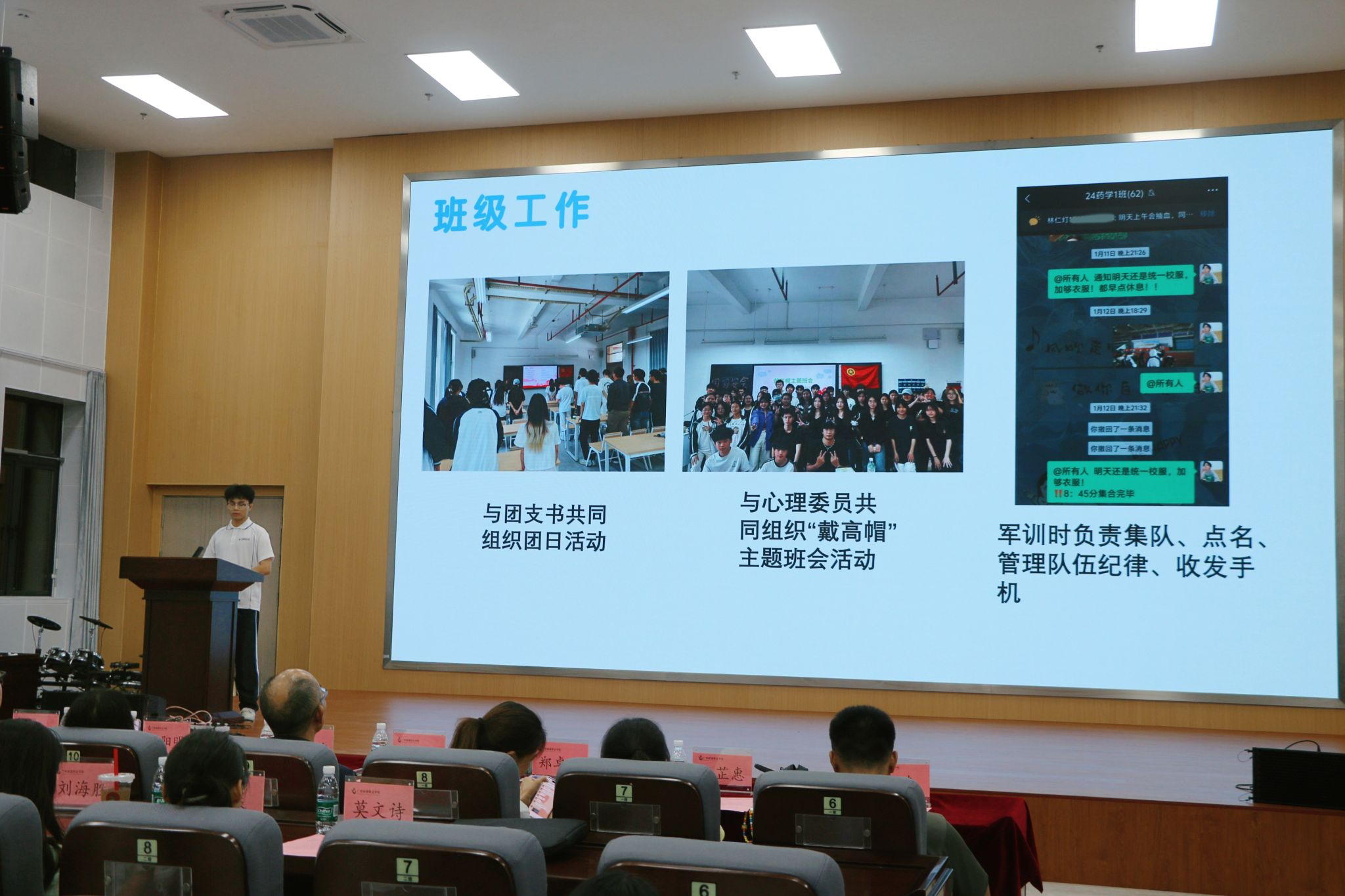 获奖代表依次上台分享经验:2024级口腔4班马炜祺作为优良学风班代表分享了班级学风建设的具体举措与成效,展现了优良学风的凝聚力量。2024级药学1班林仁灯作为先进个人代表讲述了自身在文明修身活动中的成长感悟,倡导同学们从身边小事践行文明。2024级口腔7班杨烨好作为优秀班干部代表介绍了在班级管理中推动文明修身的经验,体现了学生干部的责任担当。